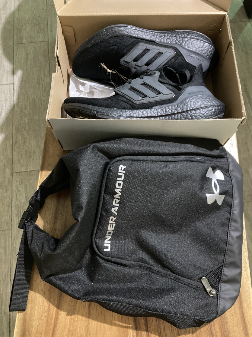 아디다스 울트라 부스트 검정 고무신, 언더아머 신발 주머니